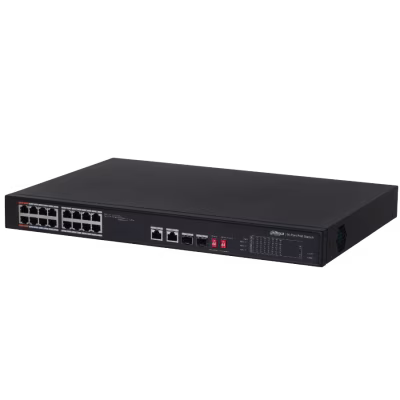 Switch PoE no gestionable L2 de Dahua. 16 puertos PoE Fast Ethernet. 2 puertos combo Gigabit (RJ45/SFP). PoE inteligente. Watchdog PoE. Consumo PoE de hasta 135W. Transmisión suave también soporta estándares IEEE802.3af, IEEE802.3at y Hi-PoE con capacidad de direcciones MAC de 8K